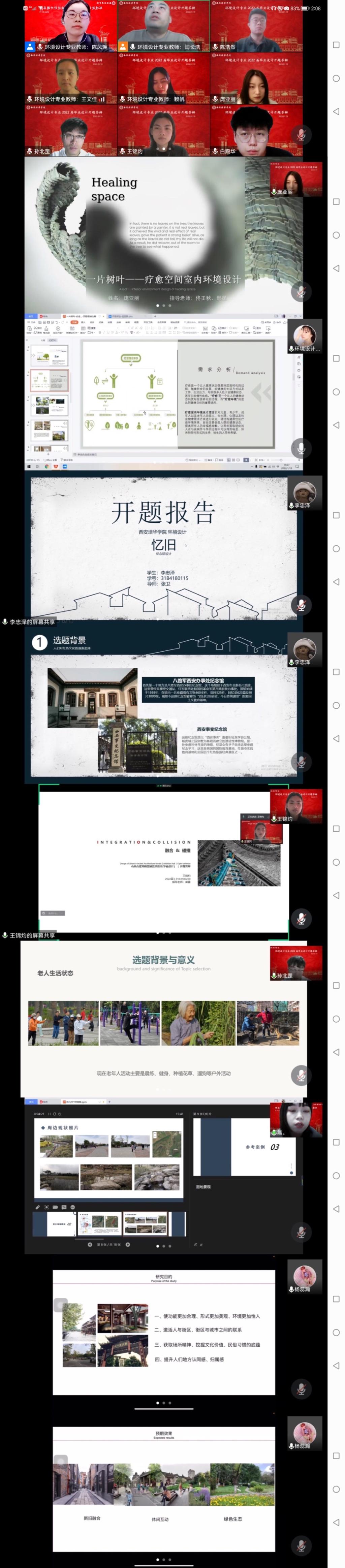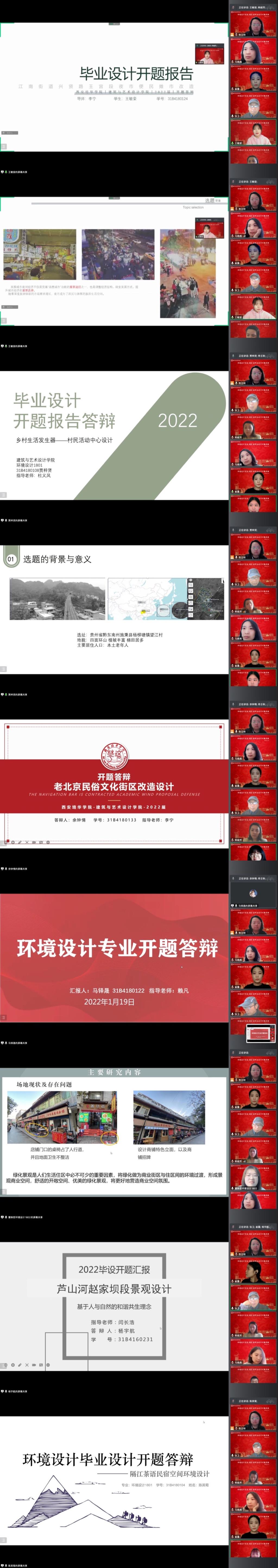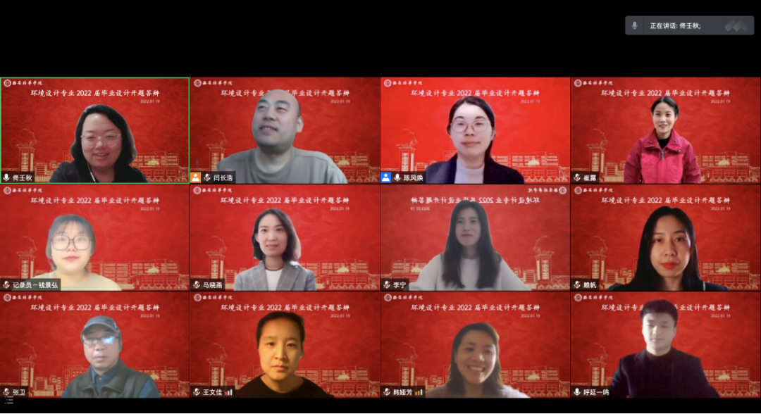 根据学校关于2022届毕业设计的工作安排,环境设计专业于1月19日进行了2022届毕业生毕业设计的开题答辩环节。答辩采用线上形式分为两组进行,共抽取本届16名毕业生参加答辩。出席并担任答辩评委的有:建筑系副主任、环境设计专业负责人韩娅芳,院督导组成员、答辩组长闫长浩副教授,答辩组长张卫副教授,环境设计专业教师王文佳、陈风焕、李宁、佟壬秋、马晓燕,答辩秘书由赖帆、崔露老师担任。