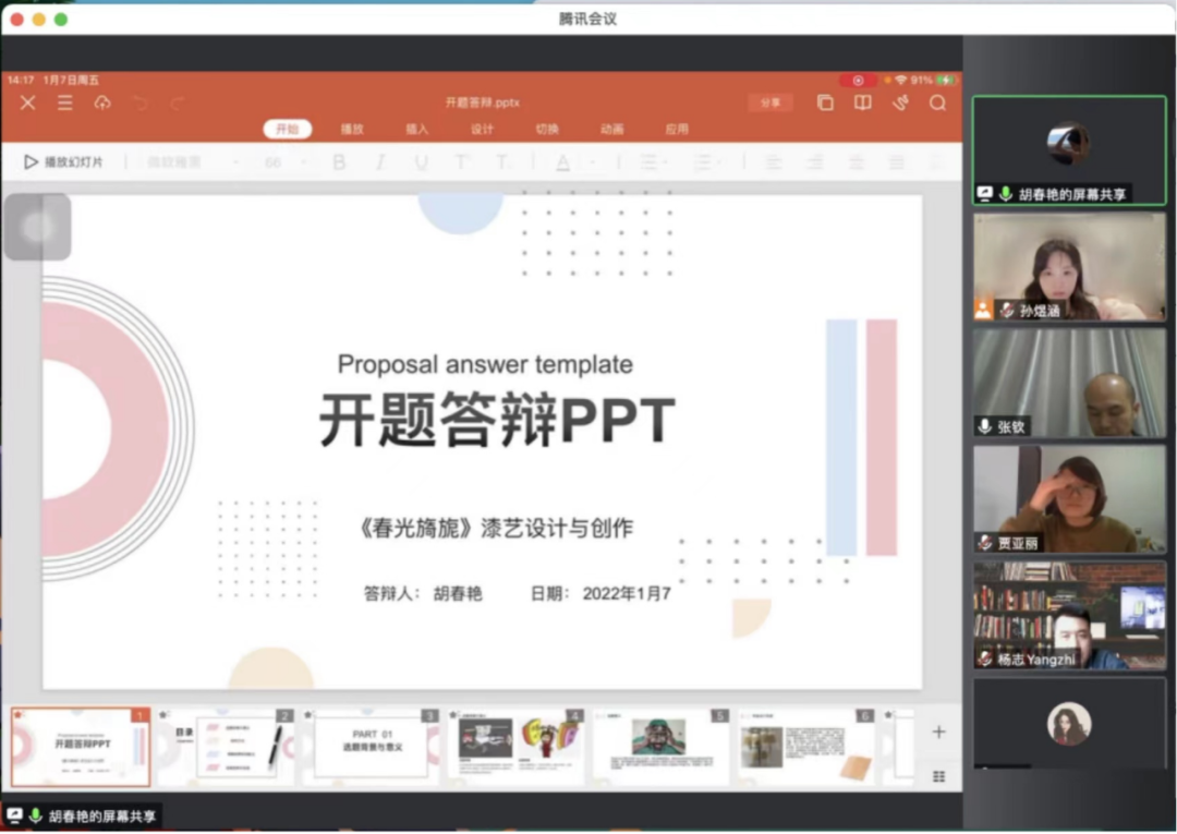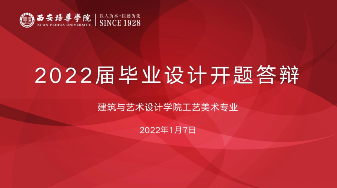 2022年1月7日14:00至17:00,工艺美术专业利用线上平台组织开展了2022届毕业设计开题答辩工作。工艺美术专业带头人杨志副教授担任答辩组组长、专业负责人贾亚丽老师、专业教师原雪娜老师、张钦老师担任答辩评委,孙煜涵老师任答辩秘书。本专业按照各指导教师指导的学生数量抽取不低于10%比例的学生参加线上答辩,其他学生以审阅开题报告的形式进行开题。