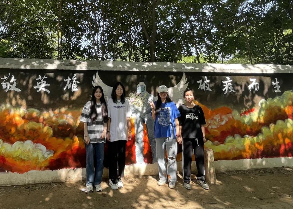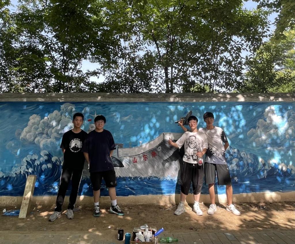 在墙绘现场,我院常务副院长徐莹、党委书记兼行政副院长王飞、党委副书记南斌红、视觉传达设计专业教师周猛猛与同学们共同创作,师生共创,实践成果收获满满。百名师生齐心协力,构图、描图、修整、上色。精心绘制,一幅幅构思巧妙、通俗易懂的墙绘作品跃然墙上。