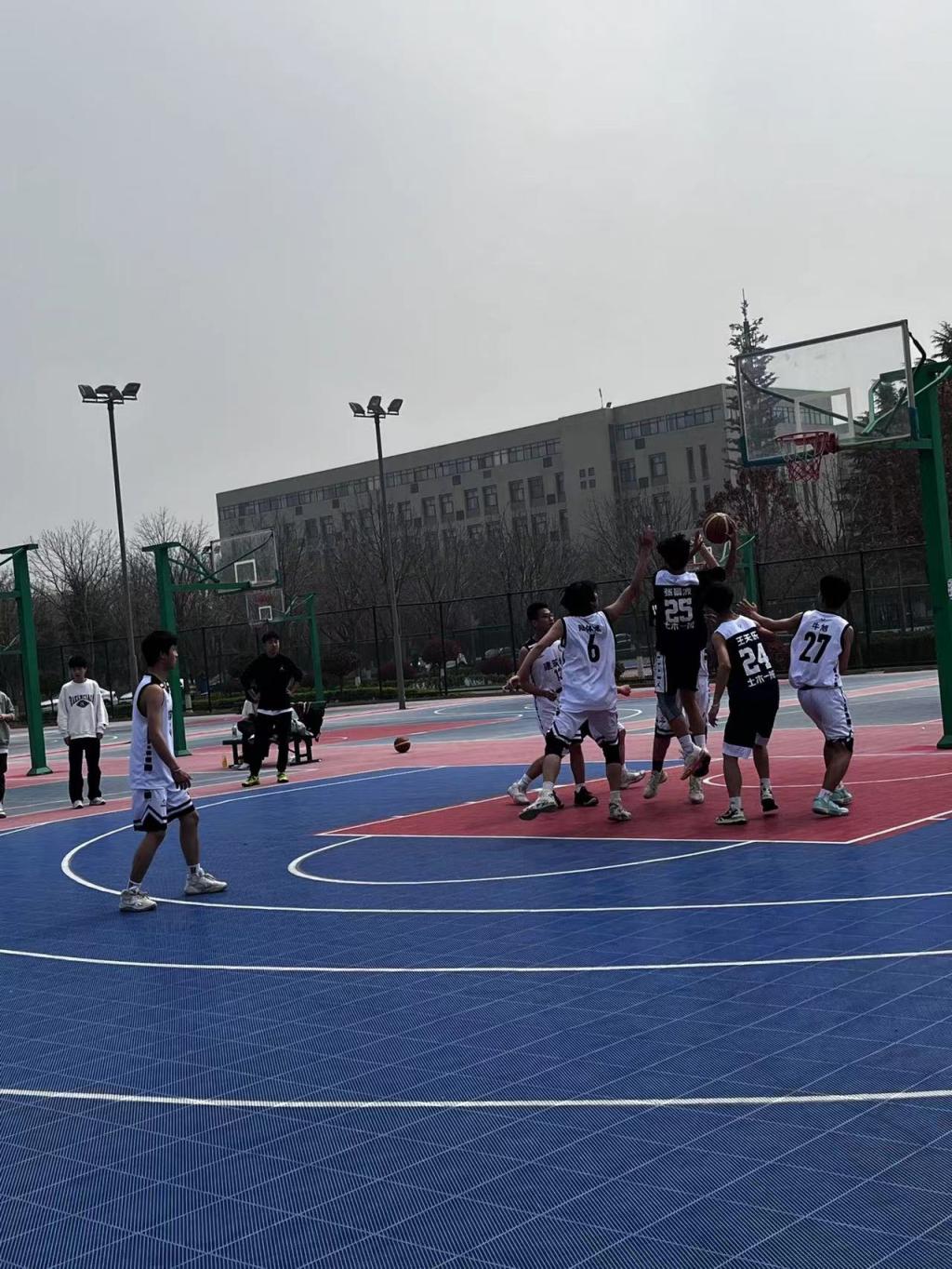 整个比赛中,篮球队员们意气风发,比赛中主动出击,以完美的配合迅速传球进攻,直逼篮板。球员的突破势如破竹,杀进内线,轻取两分,赢得了同学的阵阵喝彩。