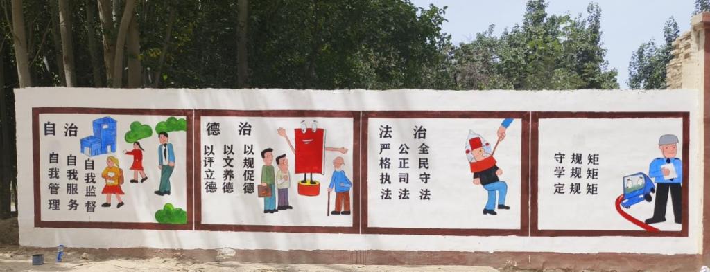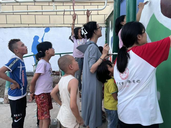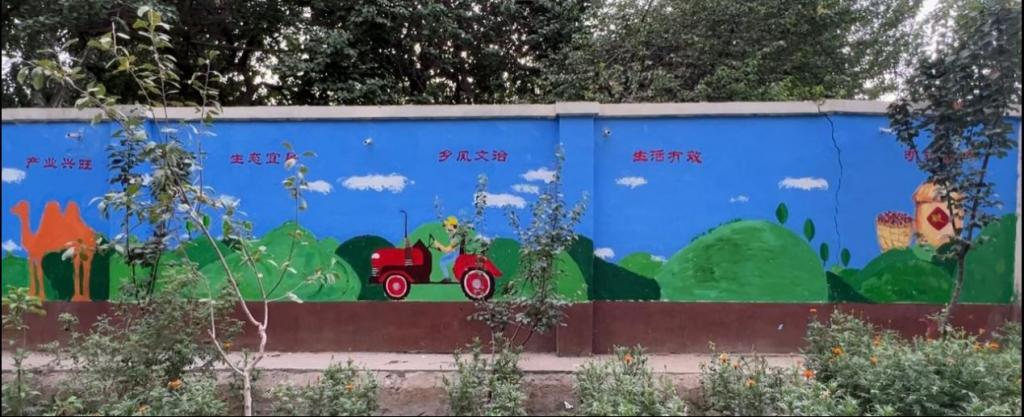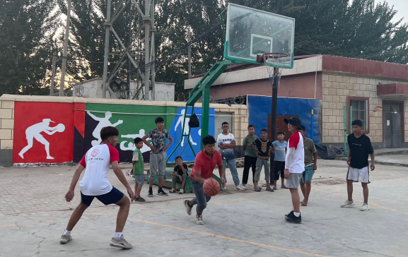 为做好乡村振兴,助力乡村发展,队员在当地顺利开展特色乡村振兴墙绘绘制工作,丰富乡村感官。文化墙绘是一种以图文并茂的方式,通过墙面的绘画来展示当地的传统文化和乡土风情。通过艺术的方式将这些文化元素展现出来,让更多人了解和关注莎车县伊什库里乡的乡村文化。同时,队员与当地各民族相处十分融洽,与孩子们进行篮球友谊赛,促进各民族之间更好的交流和融合。