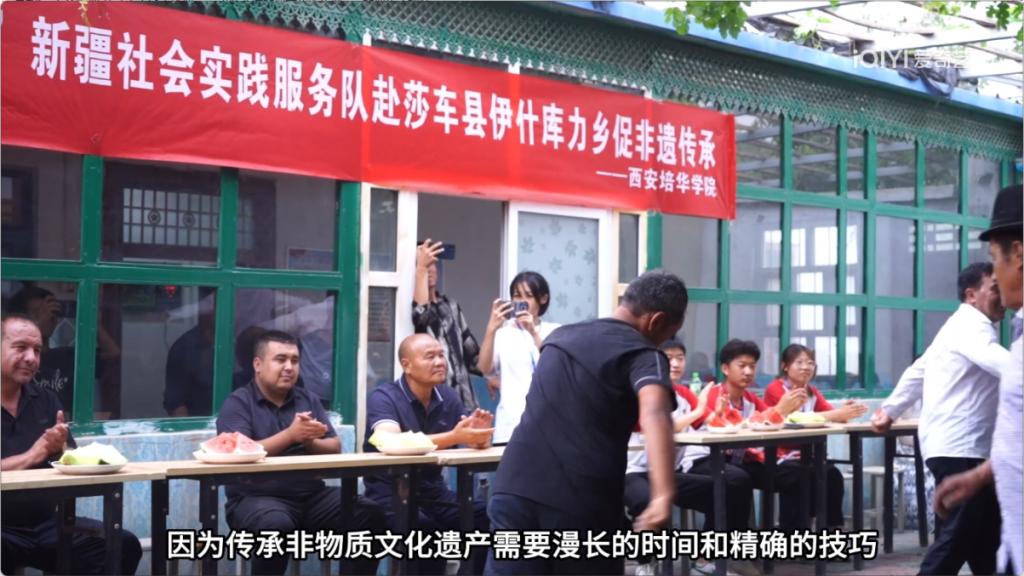 为了更好的宣传十二木卡姆非物质文化遗产,队员走访寻找喀什古城一位十二木卡姆的非遗传承人,对其进行采访。当地政府为促进非物质文化遗产“十二木卡姆”的传承与传播,请到当地“十二木卡姆”非遗传承人进行演奏,我们与传承人一同载歌载舞。随着歌声的节奏时而欢快时而阴沉,亲身体会音乐的美妙与震撼。