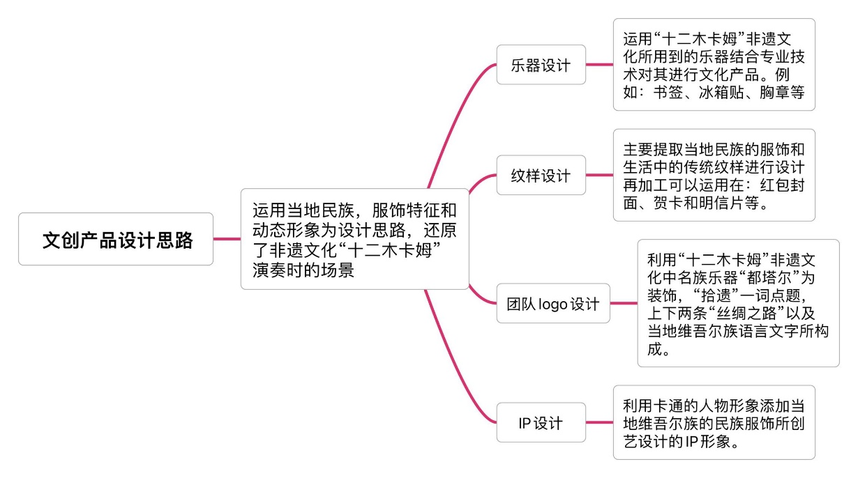 脱贫攻坚以来,对伊什库力乡开展乡村发展调研,了解当地农作物发展,为之后的文创产品设计做好前期基础研究。根据当地民俗风情,服饰纹样、非遗传承元素等设计IP形象、文创设计等。将西部地区的民族文化展示在全国各地、各民族的眼中,提高“十二木卡姆”非遗文化的悠久历史和文化知晓度。下图将部分成品进行展示。