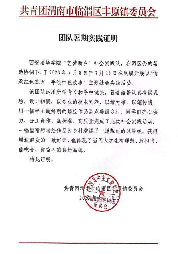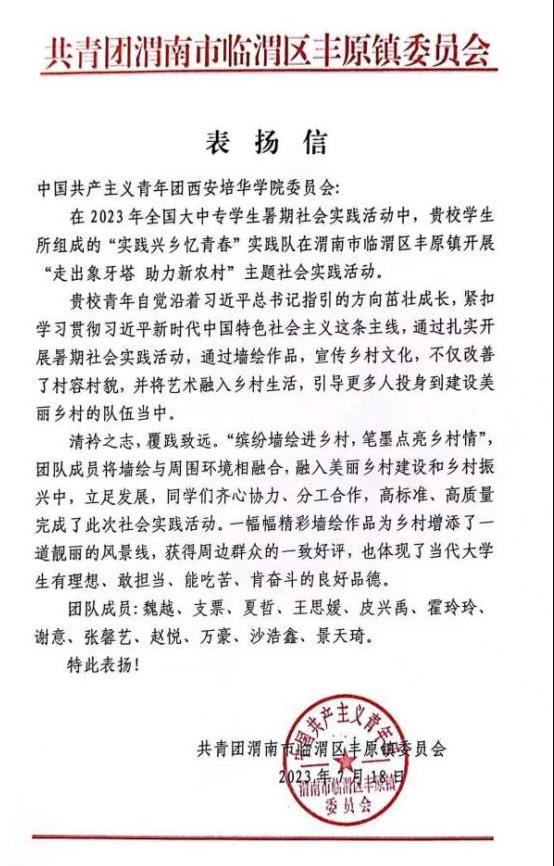 “实践兴乡忆青春社会实践队”由西安培华学院建筑与艺术设计学院一行16人组成,以“响应时代号召,助力乡村振兴”为宣传目标,积极响应团中央和团省委的统一号召,经学院领导老师前期大量的准备工作,于2023年7月7日出发,由指导老师丁亚莉、王飞等带领前往陕西省渭南市临渭区丰原镇,围绕“以专业服务社会,用画笔谱写青春”这一主题,结合自身院系和自身专业优势,秉持着以“走出象牙塔,助力新农村”的理念,开展为期2周的主题墙绘实践活动,以青春底色,绘临渭之姿。