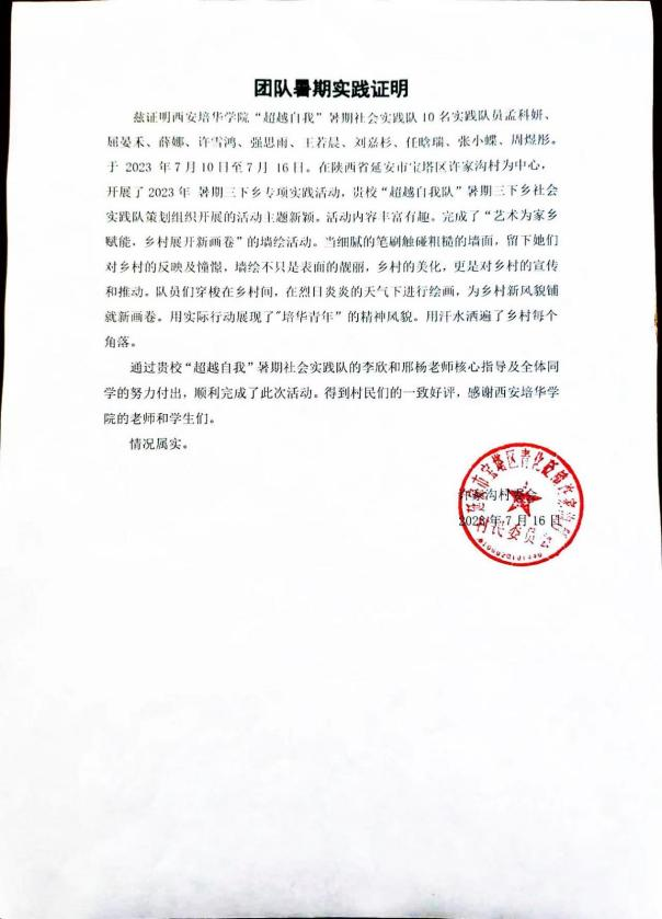 用两幅通俗易懂的墙绘作品给乡村带来了积极向上的正能量,不断拓展红色文化宣传,共同为乡村振兴注入红色动力,为美丽乡村建设增添了红色的文艺气息,发挥作为培华建筑与艺术设计院学子的风采。实践队员们在助力乡村振兴中认真做好每一项活动,积极画好每一笔墙绘。同时,用党的创新理论指引青年前进的方向,在具体实践中引领着实践队员们砥砺奋进、勇毅前行。让我们在无形中对自己有一个正确的定位,增强我们努力学习的信心和毅力,相信在今后的生活和工作当中,我们能够更好的前行。理解“艰辛知人生,实践长才干”的真正含义。