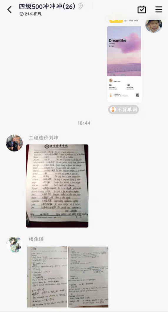 为了准备12月的四级考试,他们于7月初成立英语打卡小组,坚持每天背英语单词,如果21天可以养成一个好习惯,那么他们已然带着好习惯去冲刺自己的四级目标。