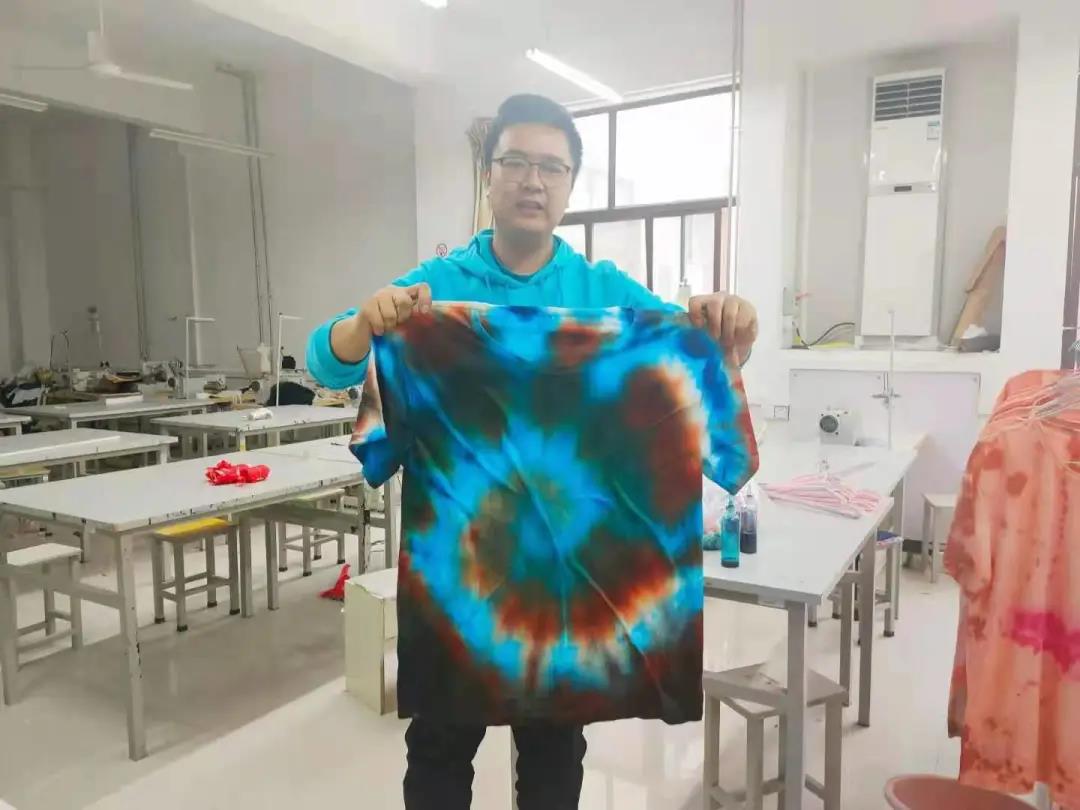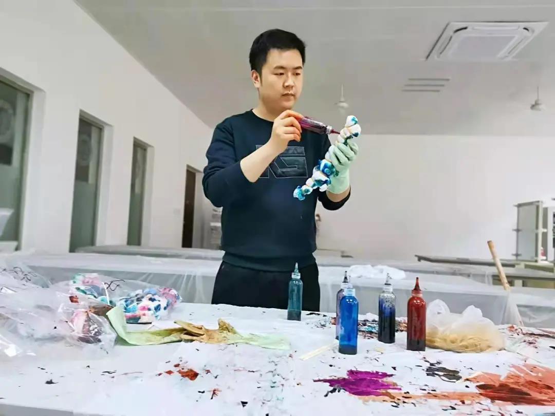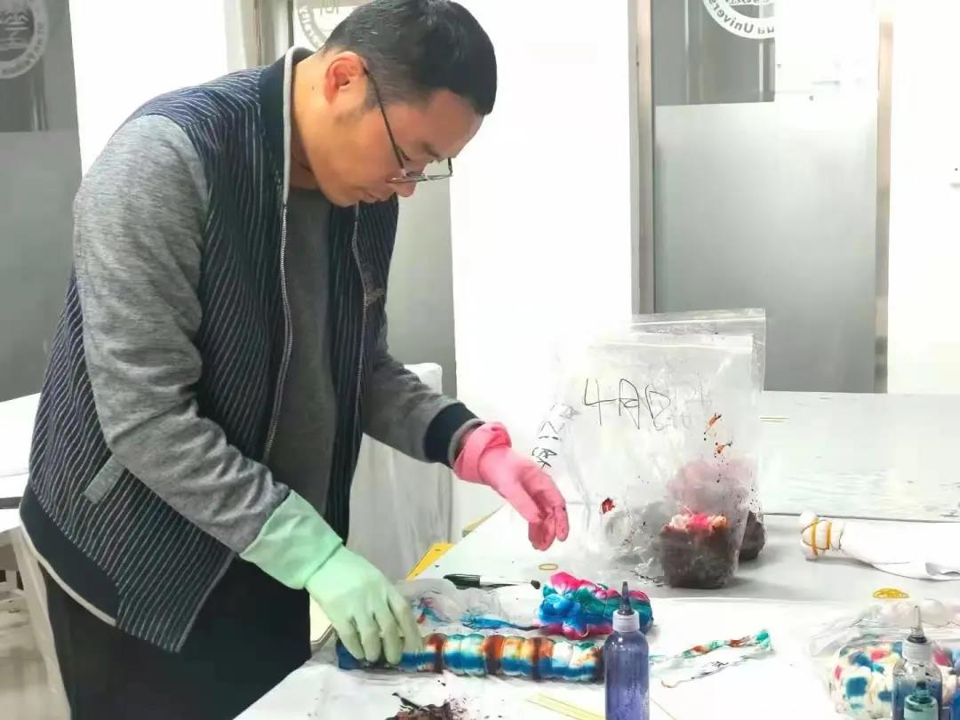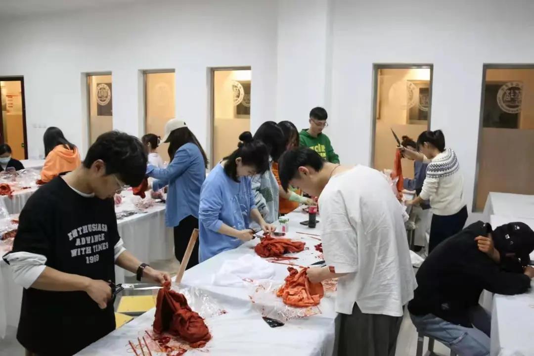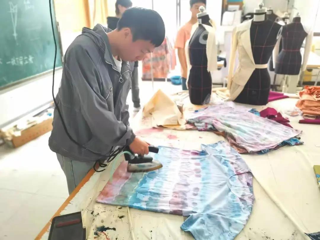 除此之外,本次运动会方阵的服装由服装设计专业的学长设计,再由建艺学子和老师们进行操作染色、清洗到最后晾晒、完成,每一件都融入了建艺学子和老师的心血。大家早早就开始了准备,从采购原料到服装扎染再到服装成型。他们全身心的投入,不漏过任何一个细节。旨在发扬我们院系风采,展现院系特色,为方队成员们设计出最独特、最具院系精神的服装。