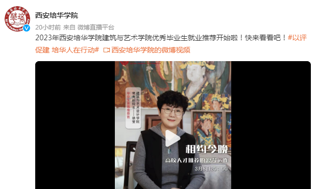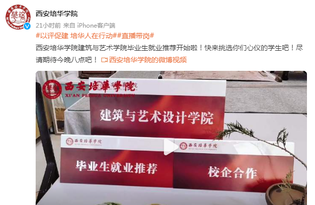 为响应国家“六稳六保”号召,进一步促进就业工作“全程化、全员化、专业化、信息化、精准化”,落实立德树人根本任务,全面贯彻三全育人,扎实做好毕业生就业工作,为学生解答就业困惑,搭建校企双方合作交流平台,全力推动2023届毕业生就业工作扎实开展,3月8日晚20点,建筑与艺术设计学院围绕“以评促建建艺人在行动”,开启毕业生就业推荐专场直播的第二场,本场直播在西安培华学院官方抖音,微博,视频号及建艺视界官方抖音平台同步直播。