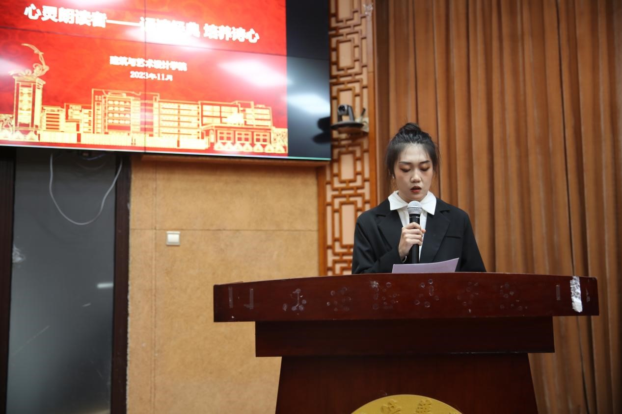 为推动心理知识普及,调动同学们参与心理健康教育活动的积极性,更好地丰富学生在校园内的课余活动,积极推进中华优秀传统文化发展,提升新时代大学生语言文化素养,我院于2023年11月20日18:30在汇知楼国学大讲堂举办“我是朗读者”心理美文诵读比赛决赛,经自主报名,班级推荐及选拔,最后有5位选手进入本次决赛。参加本次活动的评委老师有建筑与艺术设计学院党委书记兼行政副院长王飞、党委副书记南斌红、学生潜能辅导站负责老师丁亚莉,学生干事黄鑫,辅导员代表关小芳。本次活动由艺小芽学生工作站副站长马嘉励主持。