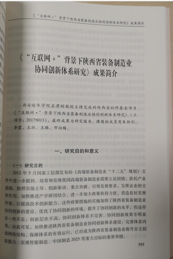 该研究报告为孟君教授团队完成的陕西省社科基金项目《“互联网+”背景下陕西省装备制造业协同创新体系研究》(项目批准号:2017S013)的最终成果。此课题从协同的视角对装备制造业创新系统进行研究,理清了装备制造业协同创新体系内部协同主体构成及相互作用机理,比较分析了不同系统要素对装备制造业创新能力提升的作用效果,通过研究能够加快推进我国装备制造业协同创新体系建设,对激活产业创新活力,实现我国装备制造产业转型升级,具有重要的理论意义和现实意义。