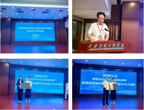西安交通工程学院院长曹庆年在活动中致辞,强调了本次校地企产学研活动对于推动产教融合、提升企业管理水平和核心竞争力以及促进教育链、人才链与产业链、创新链有效衔接的重要性,并表示将与地方政府、企业共同探索数字化转型新路径,培养高素质人才服务区域经济发展。授牌阶段,由鄠邑区科技工信局副局长常菁为西安交通工程学院授“鄠邑区科普示范基地”和“鄠邑区校地共建数字化转型示范点”牌。