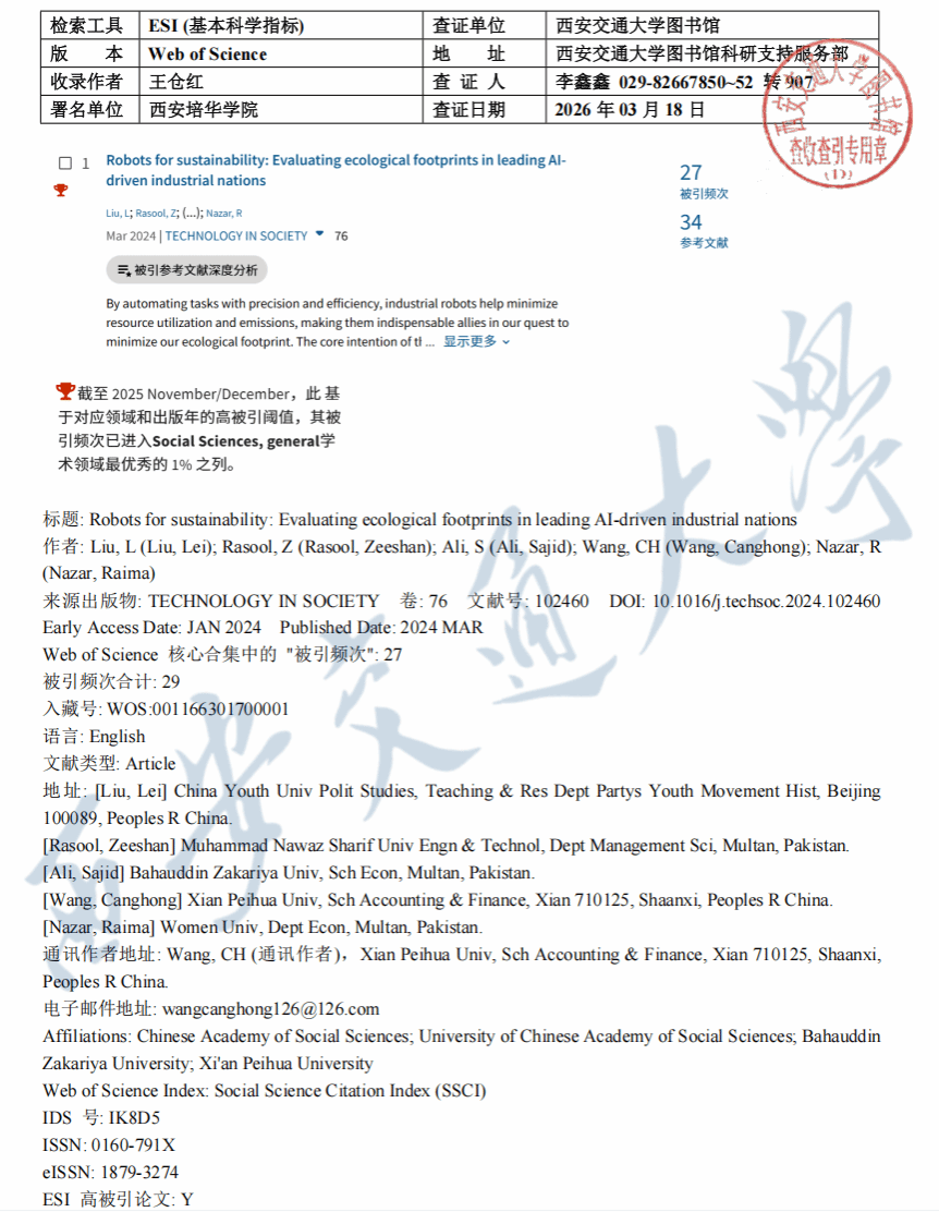 该论文以“Robots for sustainability: Evaluating ecological footprints in leading AI-driven industrial nations”为题,于2024年3月发表于国际顶尖 SSCI期刊《Technology in Society》。据悉,该期刊由Elsevier出版,JCR分区为 Q1,2025年影响因子达12.5分,在社会问题与跨学科社会科学领域排名稳居前1%,是全球该领域极具影响力的学术平台。