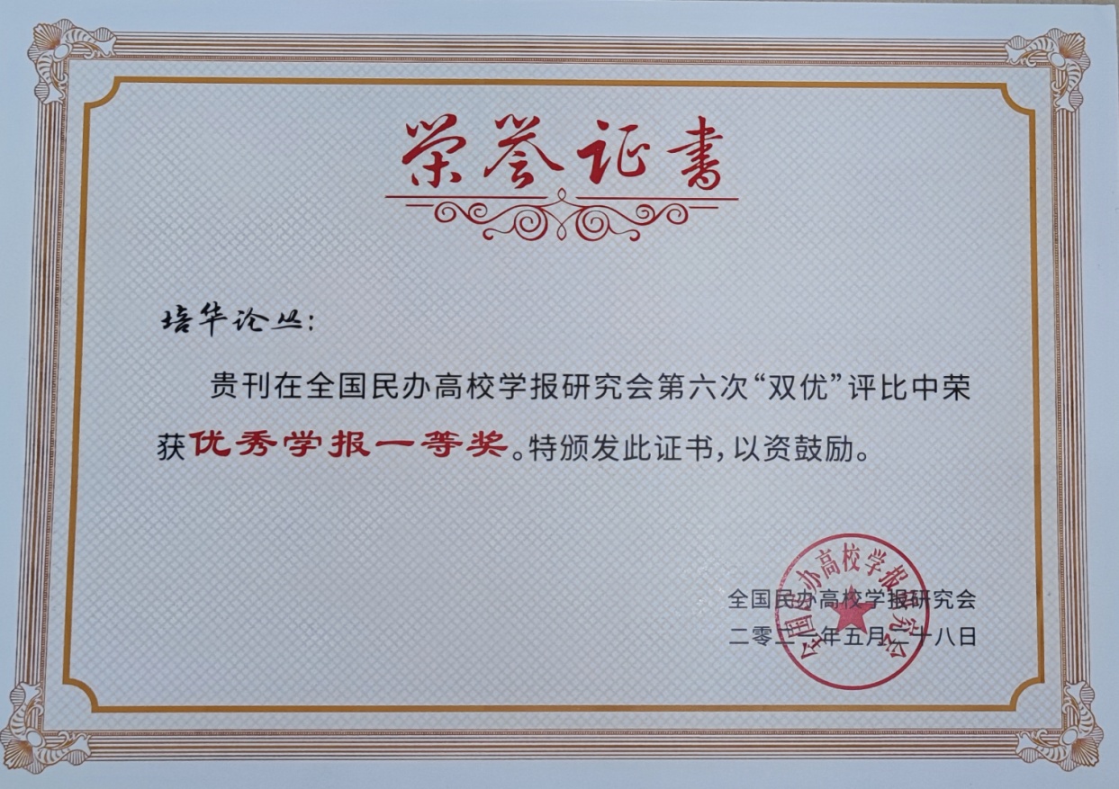 会上公布了研究会第六次优秀学报、优秀编辑学论文评比结果并给获奖单位和个人颁发了奖状。《培华论丛》荣获“优秀学报一等奖”。这是《培华论丛》创办以来首次参加的全国民办高校学报研究会评奖活动。