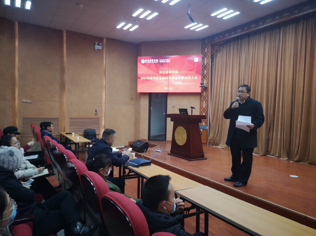 1月14日下午4:00-6:00,2021年国家自然科学基金申报动员大会在我校汇知楼国学大讲堂举行。我校科研管理中心朱广良副主任及部门工作人员、各相关二级学院负责人、科研秘书和骨干教师等50余人参加了会议。申报动员大会由校科研管理中心朱广良副主任主持。