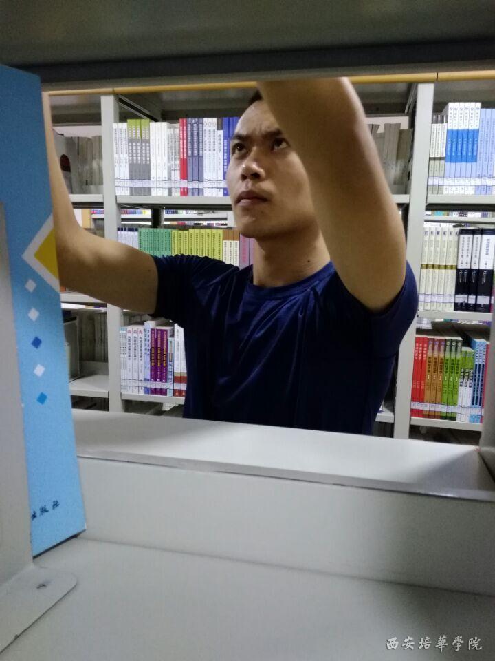 整个下午两位志愿者从图书倒架,分类、整理并进行有规律的排序,每个动作无不渗透一股军人的气息。干中学,学中干,两人很快掌握了倒架技巧及图书排序方法,看着一排排整齐有序的书架,俩个人会心地笑了。