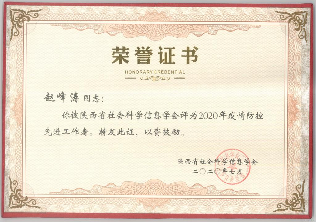作为陕西省社会科学信息学会的会员单位,我校图书馆在抗击疫情中用心服务、开拓创新,被学会授予2020年疫情防控先进集体荣誉称号;同时,赵峰涛同志被授予2020年疫情防控先进工作者