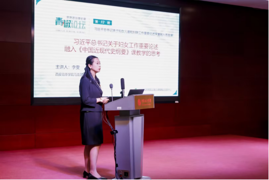 在论坛活动中,中国人民大学副校长王易、中华女子学院党委书记刘利群、湖南女子学院党委书记段美娟等领导先后致辞。在教学展示环节,7位青年教师结合教学实际,就习近平总书记关于妇女儿童和妇联工作的重要论述融入“马克思主义基本原理”“毛泽东思想和中国特色社会主义理论体系概论”“中国近现代史纲要”“思想道德与法治”“习近平新时代中国特色社会主义思想概论”“形势与政策”进行了展示。我校李雯副教授作了题为“习近平总书记关于妇女工作重要论述融入‘中国近现代史纲要’课程教学的思考”的分享。她讲到,百年党史上,中国妇女始终坚定地在党的领导下,与国家共命运,与时代同进步;妇女奋斗的光辉历史在中国共产党百年党史中意义重大;在中国近现代史纲要课程上教师要讲好百年党史中妇女奋斗的光辉历程、展示新时代十多年伟大变革中的巾帼力量;讲好新征程上妇女事业的发展远景和伟大作用。