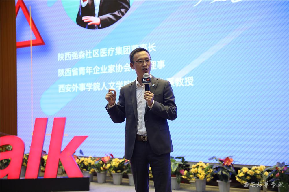 第三位作分享的是嘉宾陕西强森社区医疗集团董事长何海洋先生,他的分享主题为:“人生有更多可能”。何海洋先生通过自己三次创业经历的分享,让更多的人了解到成功背后的艰辛,他告诫在场的学生“我们的人生没有回头路,希望我们年轻学子,为了梦想不负芳华。”