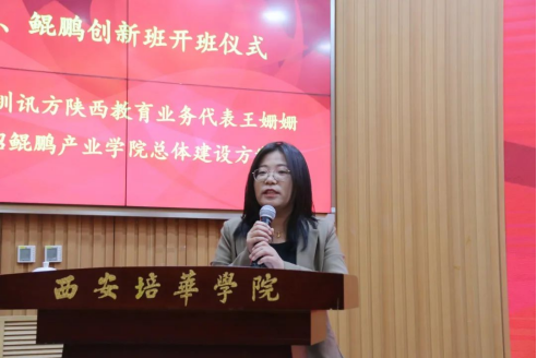 在鲲鹏创新班开班仪式上,深圳讯方陕西教育业务代表王珊珊讲述了鲲鹏产业学院总体建设方案并介绍了混编师资团队。