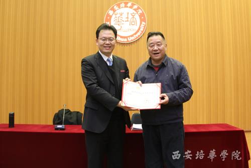 12月24日,陕西省决策咨询委员会副主任、省十届人大常委会副主任邓理来我校为广大师生作了《大学生就业择业指导》的专题讲座。讲座上,姜波理事长为邓理副主任颁发了客座教授聘书。