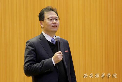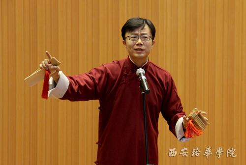 致公党陕西省筹委会副主委、省青联副主席、我校理事长姜波博士致辞。他首先对出席本次活动的各位嘉宾表示热烈欢迎,姜理事长讲到,陕西省青年联合会将为我们带来一场精彩的曲艺文化相声表演,希望同学们通过这种曲艺文化,走近大师,聆听经典,陶冶情操,共同感受艺术的魅力。今后学校将进一步引导大学生接触、理解、鉴赏高雅艺术,为青年学子提供高层次、高境界的精神文化生活,营造良好的育人环境。
