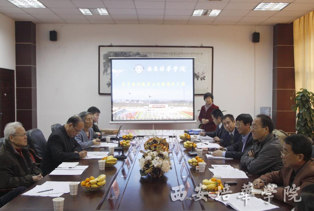 检查组首先观看了往年军训优秀成果视频,组长贺宏斌就国防教育检查工作的整体情况、教学机构等六项指标进行了详致的说明。段茂贤副院长就我校国防教育工作历年来所取得的成效,从军事技能训练和军事理论课两方面向专家组进行了详细的汇报,并从机构健全、经费到位、帮训部队选用等方面表明了学校对国防教育工作的重视。他表示,学校定期开展以爱国主义为核心的文艺演出、演讲比赛,开设军事理论选修课,举办国防教育理论讲座等,丰富大学生的国防和军事知识,培养学生的爱国主义精神、革命乐观主义精神、革命英雄主义精神。此外,把军训纳入学生大学期间教育培养规划之中,并作为学校人才培养、素质教育、校风学风建设的一个重要环节。他表示,学校将严格按照《陕西省普通高等学校国防教育课程建设实施办法》的要求,结合民办高校的特点和我校实际,把我校国防教育做出特色和做出成绩。