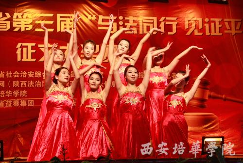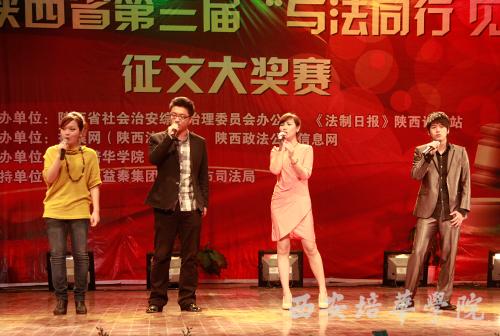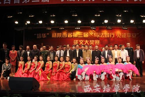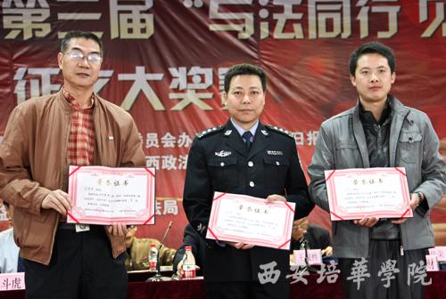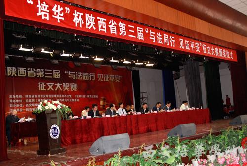 9月29日上午,由陕西省社会治安综合治理办公室、法制日报陕西记者站联合陕西法制网以及陕西省政法公众信息网共同举办的陕西省“培华杯”第三届“与法同行•见证平安”征文大赛颁奖仪式在我校大学生活动中心隆重举行。陕西省委政法委副书记刘自成,陕西省综治办副主任王永明,陕西省人民检察院调研员窦力,陕西省高级人民法院宣传处处长贾明会,陕西省监狱管理局政治部副主任黄军龙,陕西省榆林市靖边县检察院副检察长吕建荣,陕西省西安监狱副监狱长缑铁磊,秦北矿业集团董事长郑彦财,法制日报陕西记者站站长台建林,拍案网总编辑杨宝琦,西北政法大学新闻传播学院副院长王俊荣,陕西省公安消防总队防火部宣传处处长夏名文,我校党委书记王斗虎,副院长段茂贤、王根性等领导出席颁奖大会并为获奖者颁奖。本次征文大赛获奖作者和我校1000余名师生参加颁奖仪式。颁奖仪式由拍案网总编辑杨宝琦主持。