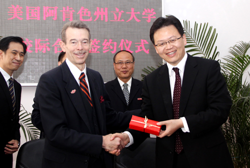 美国阿肯色州立大学常务副校长(Daniel G. Howard)博士、阿肯色州立大学中国部主任沈明华(Stephen Sim)博士等一行应邀于近日专程来我校参观访问,并于5月19日上午在我校长安校区会议室与理事长姜波博士、院长陈明华教授等领导进行了亲切友好的会谈。双方就如何建立友好校际关系、学术交流合作、开展“4+0”、“3+1”模式合作办学事宜充分交换了意见并达成了共识。座谈会结束后,双方签署了《合作交流框架协议书》和《谅解备忘录》。