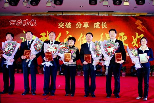 3月24日下午,西安晚报“2008中国西安·经济影响力”颁奖典礼在大唐芙蓉园曲江池畔隆重举行。西安市委常委、副市长李秋实,市人大常委会副主任夏仁朝,副市长韩松,市政协副主席陈振虎,省工商联、省工商局、省人保厅、省工信厅、省广告协会、市教育局、市委宣传部等单位负责人出席了颁奖典礼并为获奖单位和个人颁奖。此次评选共评出了“最具经济影响力人物”“最具影响力品牌(本埠)”等六个奖项。其中,我校姜波院长被评为“中国西安·最具经济影响力的人物”。
