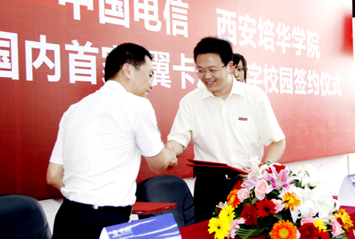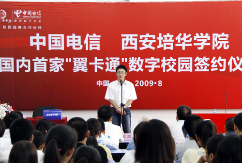 8月28日下午3时,在我校长安校区,中国电信西安分公司副总经理杨青峰与我校院长姜波一起,在阵阵热烈的掌声中走上主席台,签下国内首家“翼卡通”数字校园合约。中国电信西安分公司副总经理门长明、中国电信西安分公司市场部主任赵曼、中国电信长安分公司总经理高成泉,副总经理魏长斌;我校副院长杨定君、段茂贤、王根性及我校200余名师生代表出席了本次签约仪式。仪式由我校院办主任宋伟主持。华商报、陕西日报、西安日报、西安晚报、三秦都市报、陕西电视台、西安电视台等多家媒体到场报道。