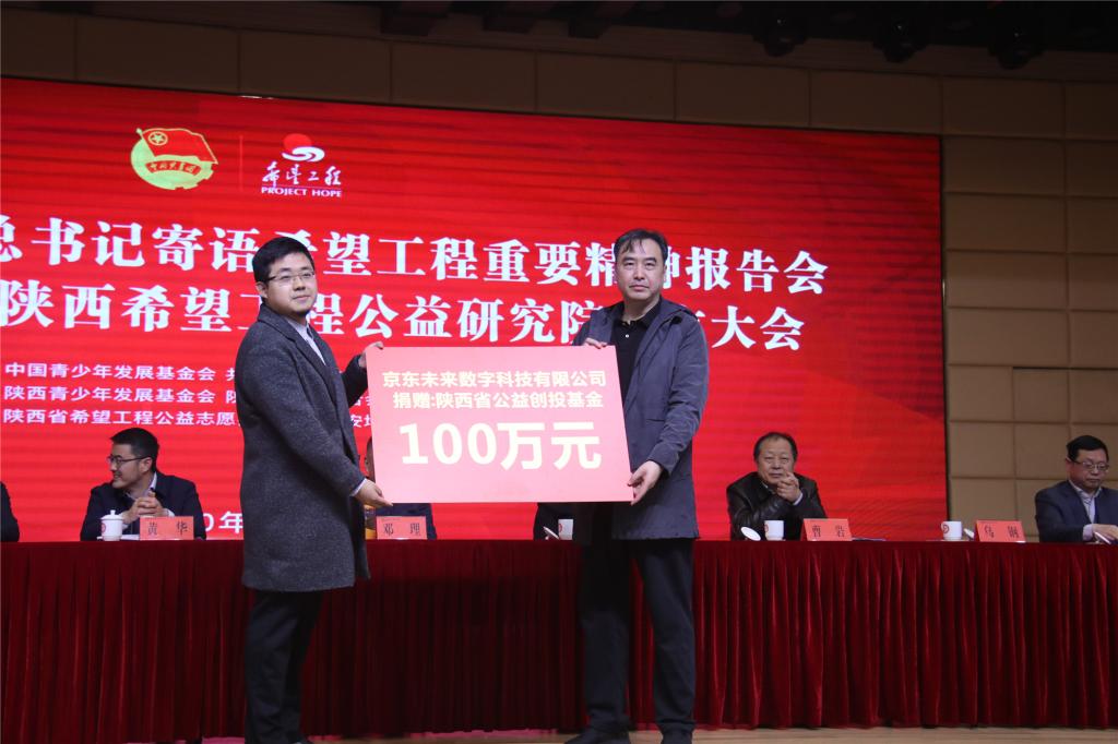 报告会上举行了全国首家希望工程公益研究院---西安培华学院陕西希望工程公益研究院揭牌活动,京东未来数字科技有限公司向陕西希望工程捐赠100万元公益创投基金,用于孵化、培育、资助希望工程青少年公益项目。