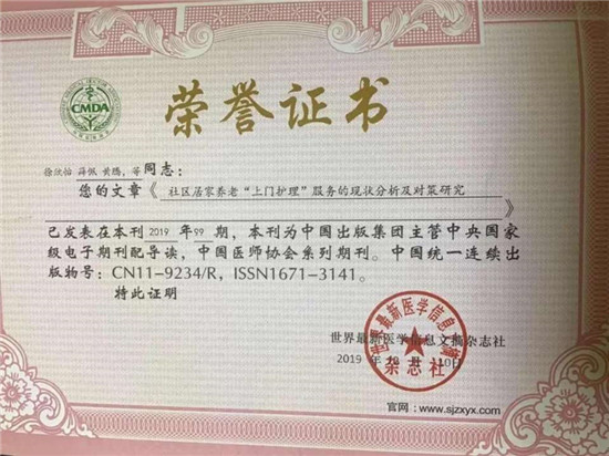 2019在年大学生创新创业大赛中主持“城市社区居家老人“上门护理”服务的现状调查与研究”省级项目(项目编号:S201911400039)并顺利结项。