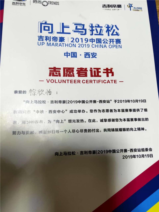 大学期间,她参与了2019年“向上马拉松(中国·西安)”志愿服务,参与2019年“长安国际女子半程马拉松暨全国女子半程马拉松锦标赛”志愿服务;参与2019年“青春灯塔大学生禁毒公益巡展活动”志愿服务;参与2019年“如新·时光跑迷你马拉松”志愿者服务等。