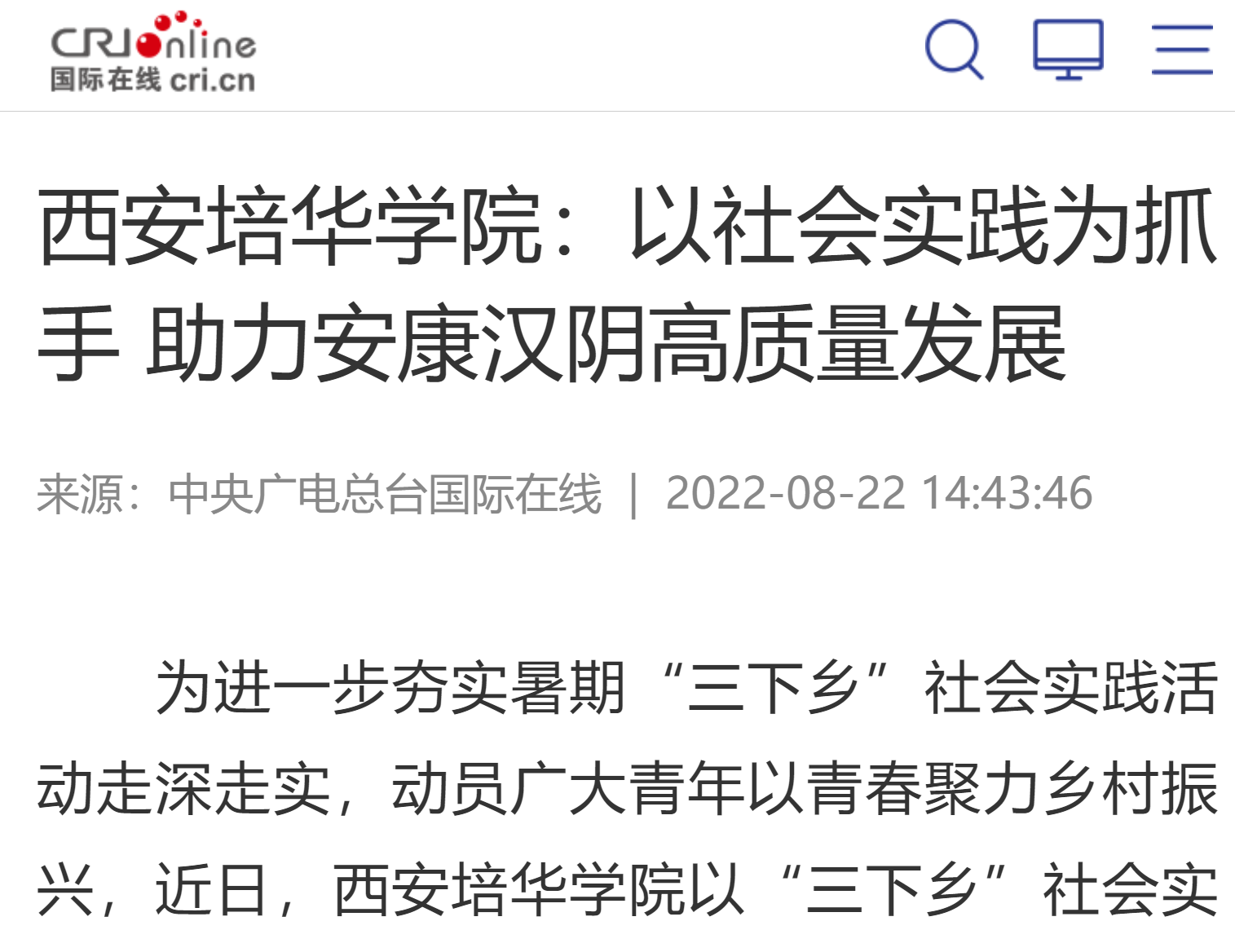 --投身社会实践,青年聚力乡村振兴。为积极助力乡村振兴,充分发挥新时代中国青年在服务基层发展、社会建设、乡村振兴的智慧力量,在安康团市委、汉阴县委县政府、乡村振兴局、团县委、县妇联等有关部门的大力支持下,西安培华学院围绕理论宣讲、法律科普、科技兴农、乡村健康、爱心支教、产业调研等实践方向,成立了西安培华学院青春聚力乡村振兴暑期“三下乡”汉阴专项实践团,下设28支实践服务队,实践足迹遍布汉阴县的 13个乡镇、28个村,服务村民近万人。在蓝天白云和绿水青山中,也留下了许多培华青年难忘的青春印迹。
