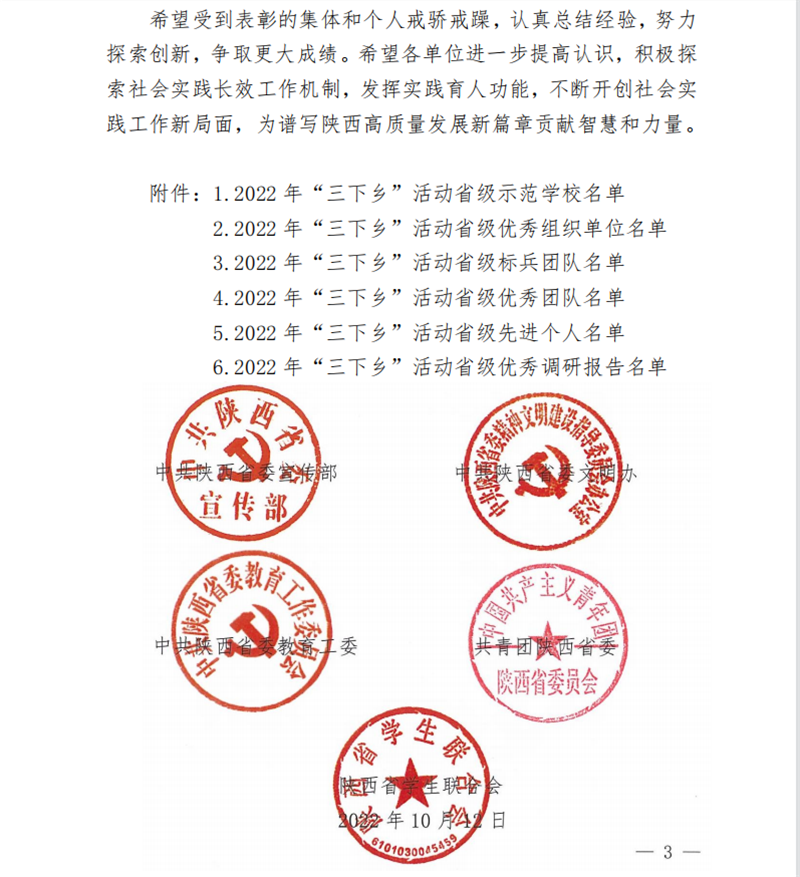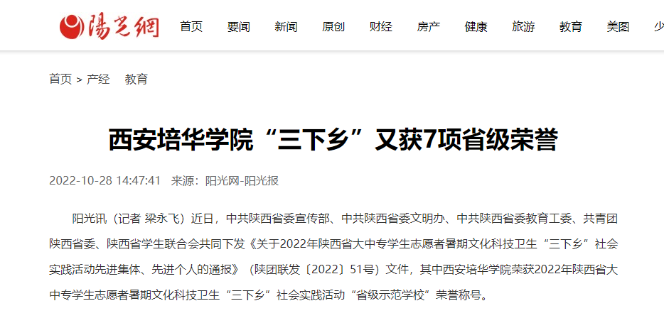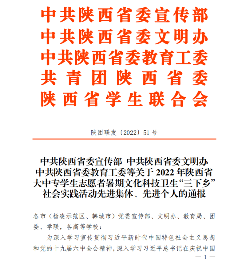近日,中共陕西省委宣传部、中共陕西省委文明办、中共陕西省委教育工委、共青团陕西省委、陕西省学生联合会共同下发《关于2022年陕西省大中专学生志愿者暑期文化科技卫生“三下乡”社会实践活动先进集体、先进个人的通报》(陕团联发〔2022〕51号)文件,其中西安培华学院荣获2022年陕西省大中专学生志愿者暑期文化科技卫生“三下乡”社会实践活动“省级示范学校”荣誉称号。