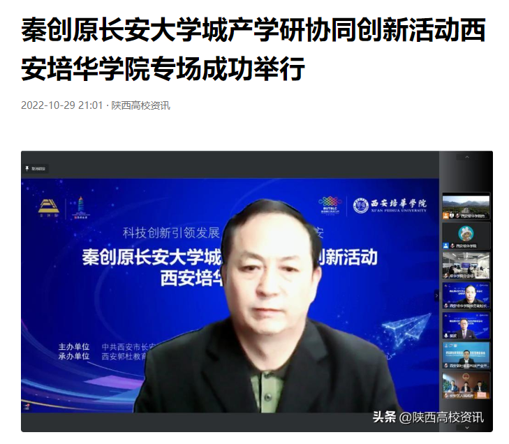 会上,西安郭杜教育科技产业开发区管委会主任赵鹏介绍了长安区秦创原工作情况。长安区充分发挥长安大学城学科、人才、科创、技术等资源优势,把促进秦创原科技成果转化作为长安进行转型升级、推动高质量发展的关键。此次西安培华学院线上专场活动,也是再次深入推进秦创原创新驱动平台建设的有力举措,是校地融合发展的有益实践。
