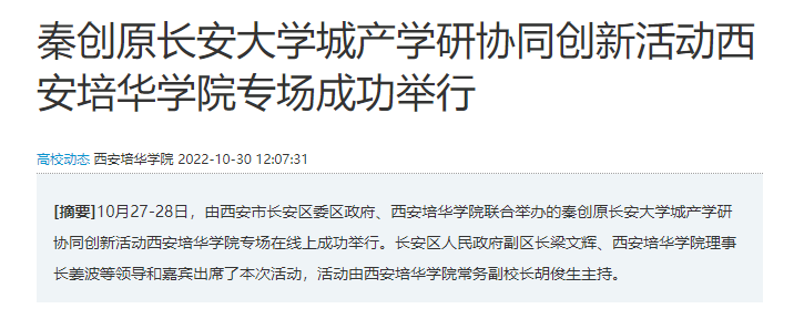 10月27-28日,由西安市长安区委区政府、西安培华学院联合举办的秦创原长安大学城产学研协同创新活动西安培华学院专场在线上成功举行。长安区人民政府副区长梁文辉、西安培华学院理事长姜波等领导和嘉宾出席了本次活动,活动由西安培华学院常务副校长胡俊生主持。