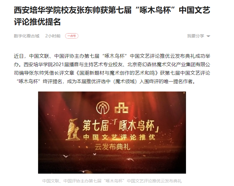 近日,中国文联、中国评协主办第七届“啄木鸟杯”中国文艺评论推优云发布典礼成功举办。西安培华学院2021届播音与主持艺术专业校友、北京奇幻森林魔术文化产业集团有限公司编导张东帅凭借长评文章《国潮新题材与魔术创作的艺术和鸣》获第七届中国文艺评论“啄木鸟杯”终评提名,成为本届推优评选中(魔术领域)入围终评的唯一提名作者。