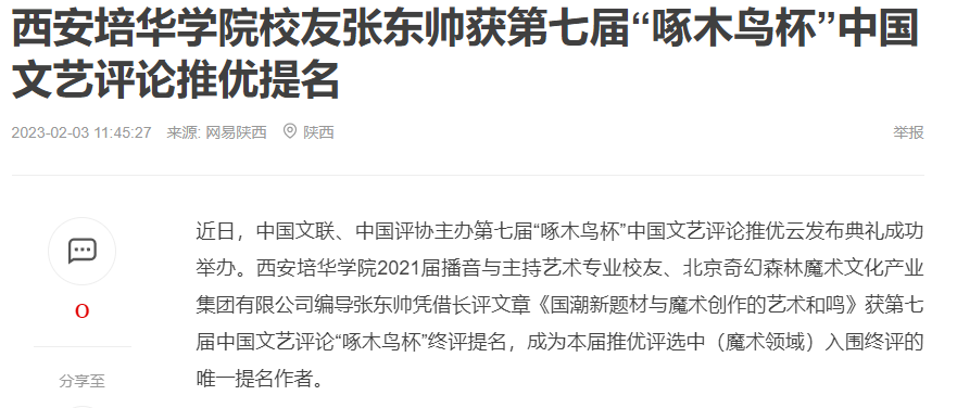 近日,中国文联、中国评协主办第七届“啄木鸟杯”中国文艺评论推优云发布典礼成功举办。西安培华学院2021届播音与主持艺术专业校友、北京奇幻森林魔术文化产业集团有限公司编导张东帅凭借长评文章《国潮新题材与魔术创作的艺术和鸣》获第七届中国文艺评论“啄木鸟杯”终评提名,成为本届推优评选中(魔术领域)入围终评的唯一提名作者。