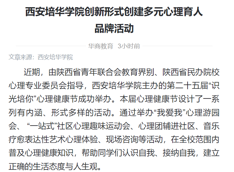 该校学生潜能发展中心主任韩赟表示,心理健康教育作为落实立德树人根本任务的重要抓手,西安培华学院坚持将育心和育人相结合,以生涯规划为引领,促进学生心理健康,助力大学生身心健康发展为目标,进一步提升大学生心理健康工作的针对性和有效性,持续多样化、立体化、个性化探索心理育人新模式和新方法。