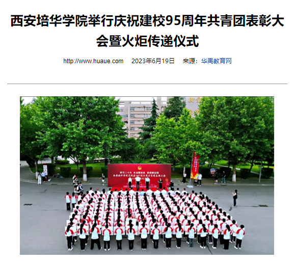 6月15日,西安培华学院庆祝建校95周年共青团表彰大会暨火炬传递仪式在学校长安校区举行。西安培华学院理事长姜波,校长李映方,党委副书记、副校长姚文静,监事会主席、党委副书记、纪委书记、工会主席徐国富及二级学院和职能部门的负责人参加了此次仪式。