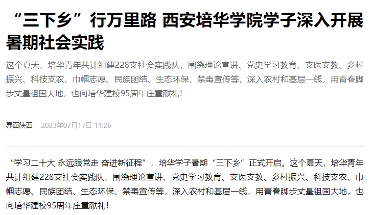 时代各有不同,青春一脉相承。暑期“三下乡”实践活动中,培华学子在亲身经历中,坚定理想信念,了解国情民情社情、练就过硬本领,把青春奉献在党和国家最需要的地方,在社会实践的舞台上谱写更新、更美的篇章!