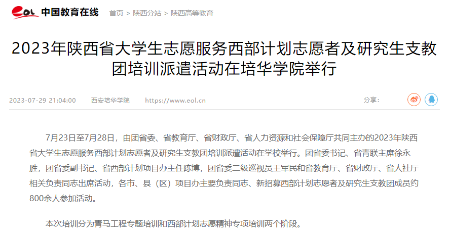 中国教育在线:2023年陕西省大学生志愿服务西部计划志愿者及研究生支教团培训派遣活动在培华学院举行