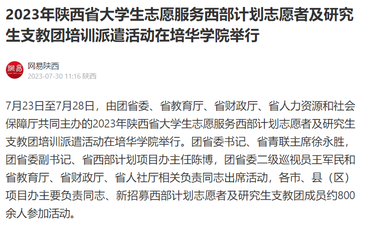 网易新闻:2023年陕西省大学生志愿服务西部计划志愿者及研究生支教团培训派遣活动在培华学院举行