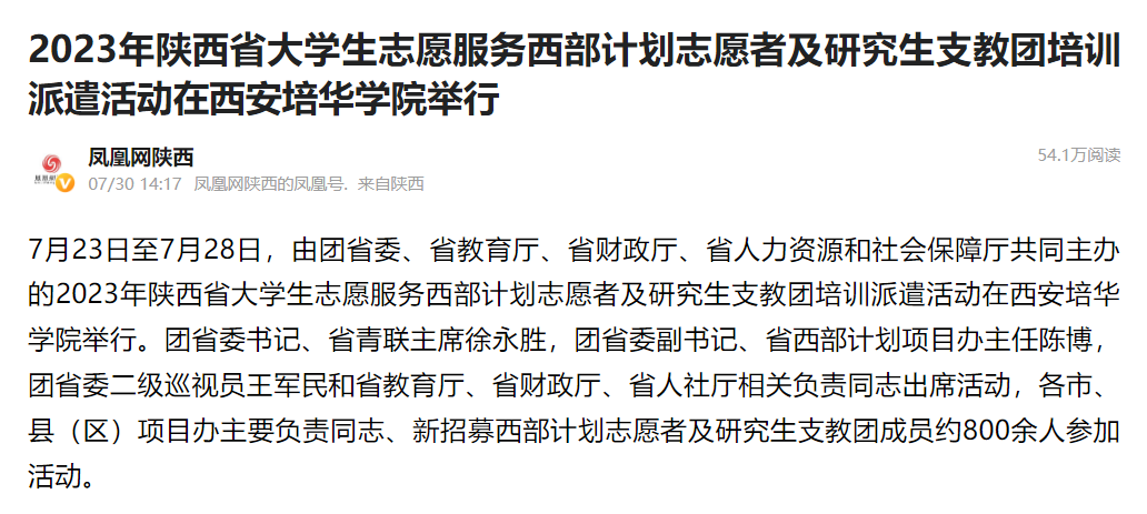 凤凰网:2023年陕西省大学生志愿服务西部计划志愿者及研究生支教团培训派遣活动在西安培华学院举行
