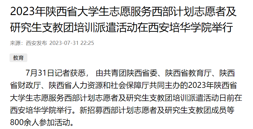 7月31日记者获悉, 由共青团陕西省委、陕西省教育厅、陕西省财政厅、陕西省人力资源和社会保障厅共同主办的2023年陕西省大学生志愿服务西部计划志愿者及研究生支教团培训派遣活动日前在西安培华学院举行。新招募西部计划志愿者及研究生支教团成员等800余人参加活动。