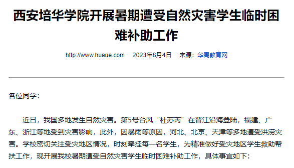 近日,我国多地发生自然灾害。第5号台风“杜苏芮”在晋江沿海登陆,福建、广东、浙江等地受到灾害影响,此外,因暴雨等原因,河北、北京、天津等多地遭受洪涝灾害。学校密切关注受灾地区情况,时刻牵挂每一名学生,为精准做好受灾地区学生救助帮扶工作,现开展我校暑期遭受自然灾害学生临时困难补助工作,具体事宜如下: