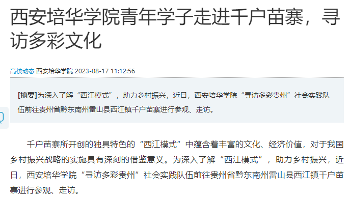 本次实践活动以苗寨为契机,立足于特色民族文化和非物质文化遗产资源,拓宽了全体队员的视野,增强了他们对中华民族多元文化的尊重和珍视,对苗族文化的传承发展起到了积极的促进作用,同时帮助队员们走入产业基地,切身感受产业发展变革,增强队员们对乡村振兴的理解、对非物质文化遗产的自豪感和中华民族一家亲的认同感,扩大产业文化和民族文化的新时代影响力。时间队员们还纷纷表示,他们会通过专业所学,拍摄记录苗寨丰富的文化资源,以及特色的发展之路,将会通过视频的方式传播千户苗寨的特色文化,让千户苗寨的文化“宝藏”绽放更璀璨的光辉,从而为乡村振兴贡献一份自己的力量。