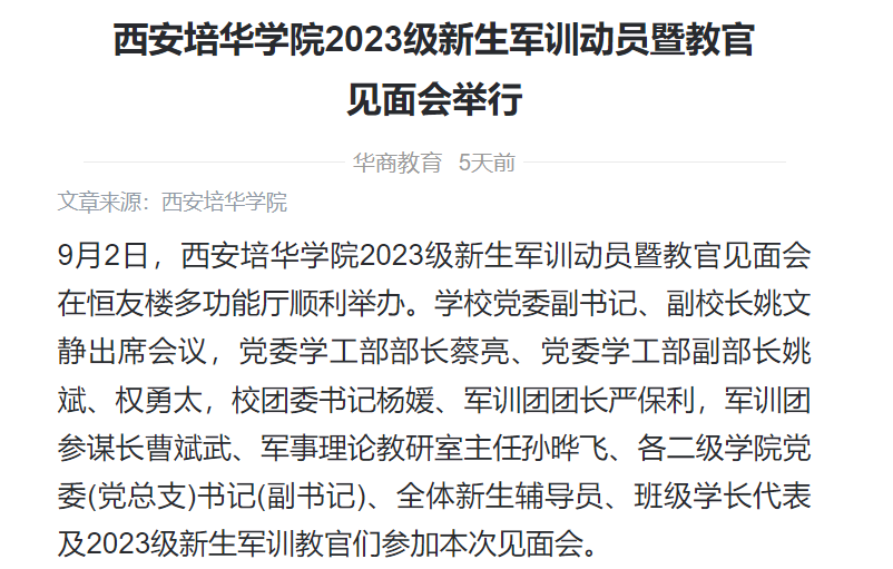华商教育:西安培华学院2023级新生军训动员暨教官见面会举行
