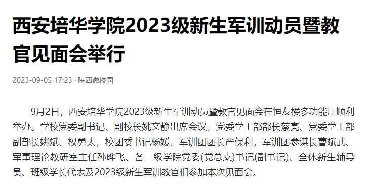 今日头条:西安培华学院2023级新生军训动员暨教官见面会举行